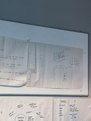 As soon as we started brainstorming, we realised that we could not move forward with our concept. We started thinking about the design and the concept of our installation, but we realised that we were not creating an unforgettable experience. We then wrote down what we think about when we talk about an "immersive experience" and this discussion was very fruitful. We came up with many new ideas, which would add a lot to our installation. Furthermore, we also came up with a little scenario: